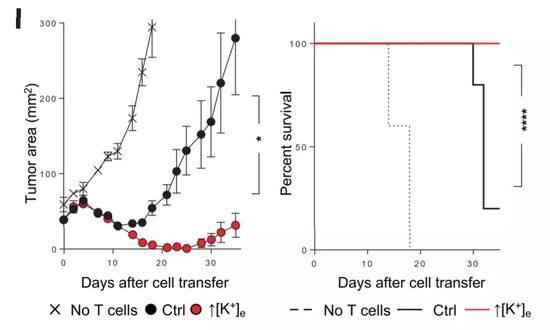 在小鼠體內(nèi) ,這些細(xì)胞的療效也得到了證實 。同樣是經(jīng)過鉀離子的處理后,擴增的T細(xì)胞被輸注回了黑色素瘤小鼠體內(nèi)。研究發(fā)現(xiàn),沒有接受任何T細(xì)胞輸注的小鼠,不到20天就全部死亡 ;接受普通T細(xì)胞輸注的小鼠雖然活得更久 ,但在治療的30多天后 ,死亡率就接近80% 。相比之下 ,已經(jīng)在體外歷經(jīng)過鉀離子洗禮的T細(xì)胞 ,面對惡劣的腫瘤微環(huán)境 ,展現(xiàn)出了驚人的治療效果 。30多天后,小鼠的存活率高達100% ,腫瘤面積也得到了很好的控制 。