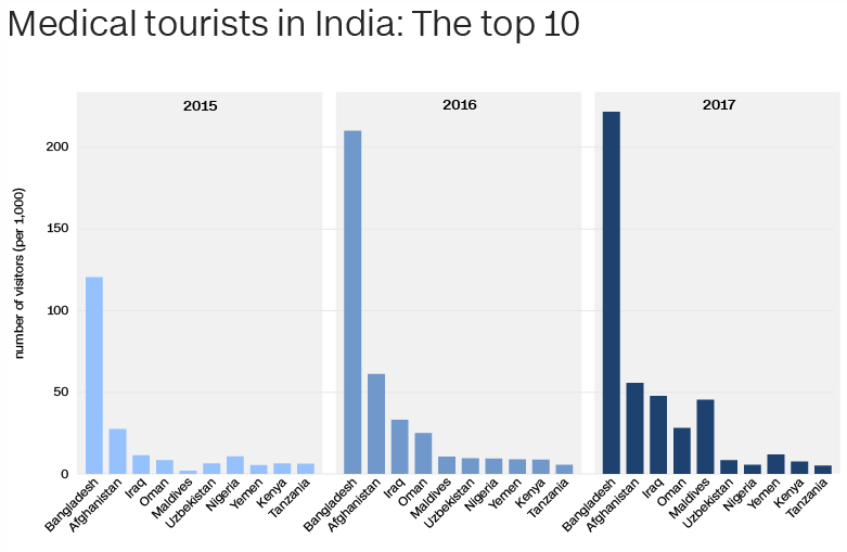2015年 ,印度醫(yī)療旅游業(yè)價(jià)值30億美元 ,排名全球第三 ,持醫(yī)療簽證入境的外國(guó)游客人數(shù)接近23.4萬(wàn)人人 。到2017年,人數(shù)增加了一倍多,接近50萬(wàn)人。