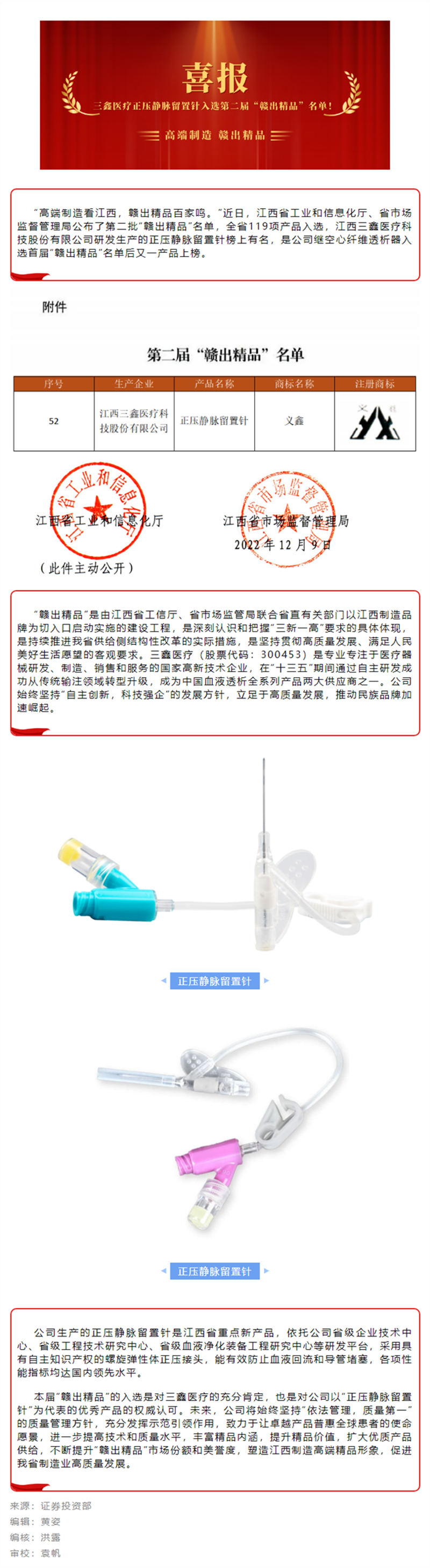 喜訊 | 香港馬買(mǎi)馬網(wǎng)站醫(yī)療正壓靜脈留置針入選第二屆“贛出精品”名單 !